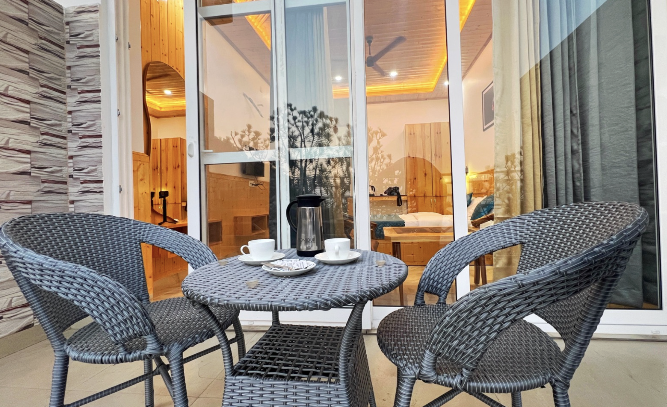 The interiors are a tribute to contemporary mountain living, featuring expansive windows that frame the shifting shadows of the valley. Whether you are lounging in the premium linens after a day of forest trekking or enjoying a quiet morning coffee, the seamless integration of high-end cooling and warm wooden aesthetics ensures an unmatched stay. Designed for the traveler who demands both the untamed beauty of the Pine Valley and the refined luxury of a temperature-perfect retreat, this room invites you to relax in style at The Pine Paradise.